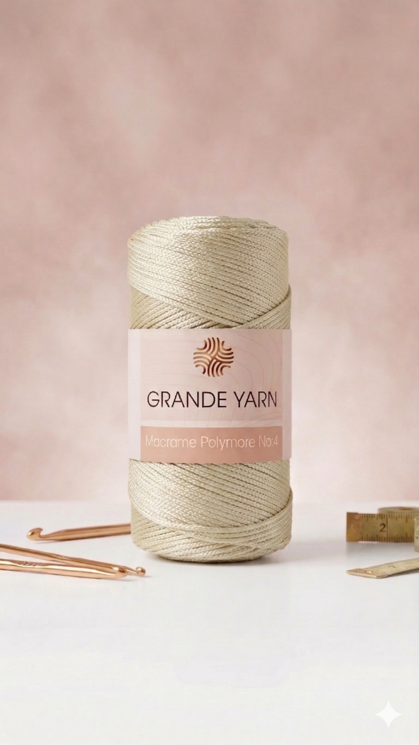 Macrame Polymore No. 4 by Grande Yarn – ένα ανθεκτικό νήμα από 100% πολυπροπυλένιο που προσφέρει σταθερότητα και ελαφρύ αποτέλεσμα και λάμψη στο πλέξιμο, με 225 μέτρα ανά 200 gr κουβάρι και προτεινόμενο βελονάκι Νο. 3,5 – 4,5, ιδανικό για πλεκτές τσάντες, καλαθάκια και διακοσμητικά projects. 🧶✨