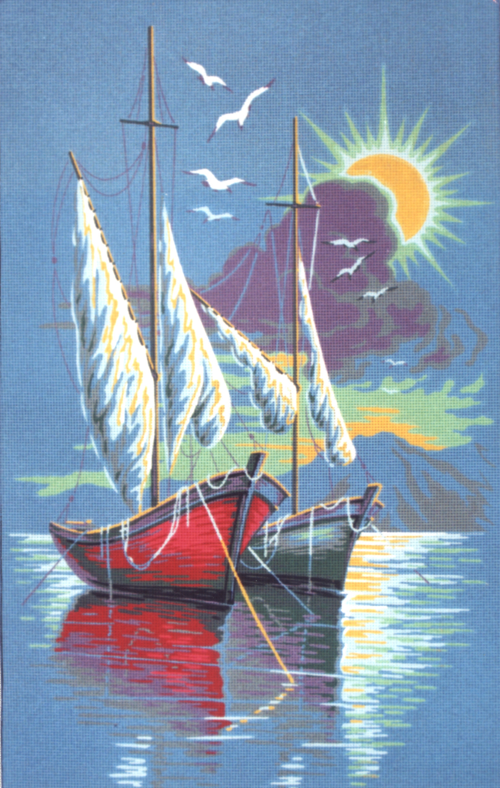 The paintings are stamped on canvas in khaki N8 or N7 depending on the design, with colour for ease of embroidery.