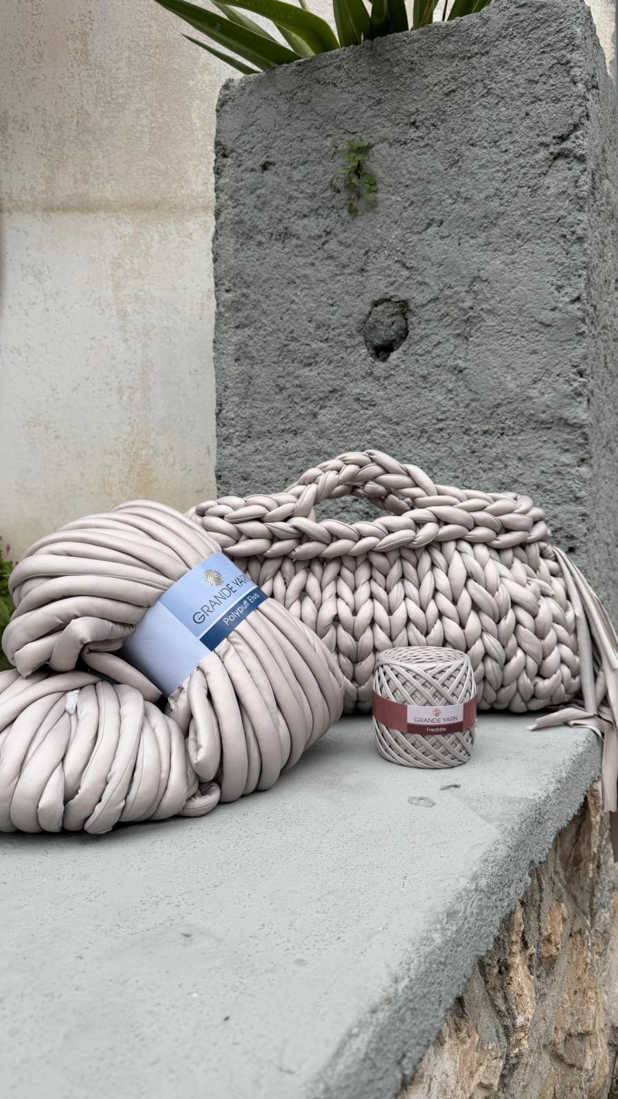 Cree un bolso moderno y estructurado con un impresionante efecto cuero. El kit incluye 2 fardos de cuero Polypuff Elvis (30 m cada uno) y 1 Freddie (50 metros) para completar el diseño con elegantes flecos. Ideal para creaciones de moda hechas a mano con textura premium. ✨