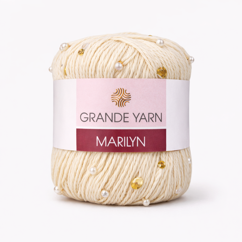 Marilyn by Grande Yarn (50gr., 130m) — βαμβακερό νήμα με ενσωματωμένες χάντρες και πούλιες, διακριτική λάμψη και premium fashion αισθητική. Ιδανικό για κομψές εσάρπες, μπλουζάκια, μπουστάκια, φούστες και statement χειροποίητες δημιουργίες που ξεχωρίζουν ✨🧵
