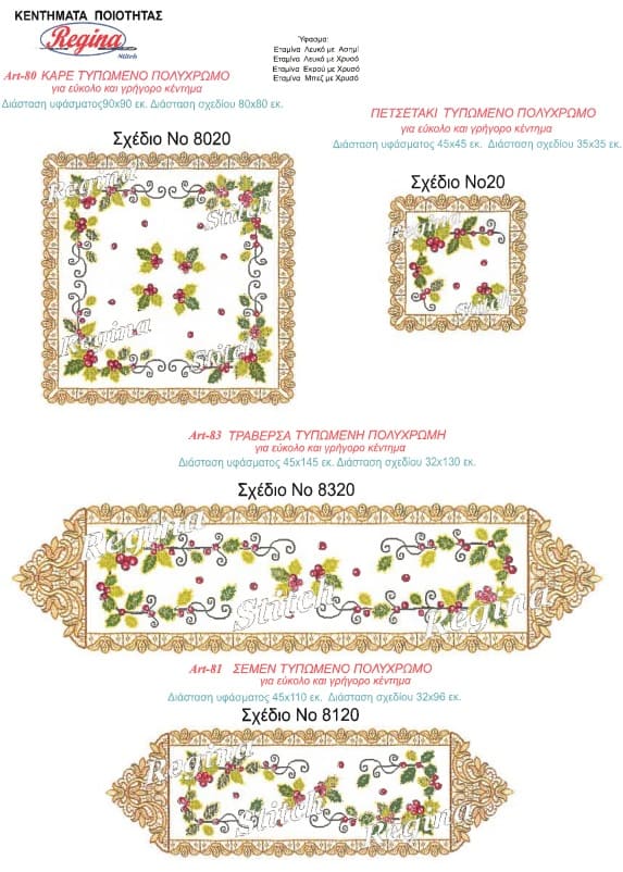 | Επιλογή κεντήματος | Όλο το σέτ, Όλο το σέτ με κλωστές, Τραβέρσα, Τραβέρσα με κλωστές, Καρέ, Καρέ με κλωστές, Πετσετάκι, Πετσετάκι με κλωστές, Σεμέν, Σεμέν με κλωστές, Τραπεζοκαρέ, Τραπεζοκαρέ με κλωστές |