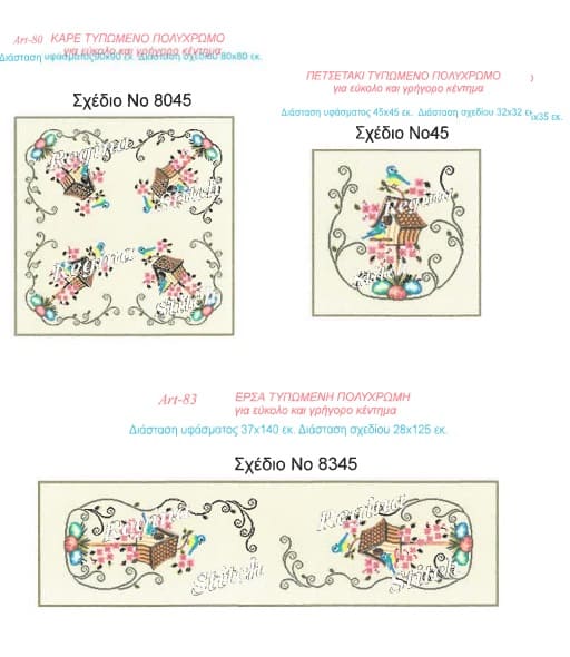 | Επιλογή κεντήματος | Όλο το σέτ, Όλο το σέτ με κλωστές, Τραβέρσα, Τραβέρσα με κλωστές, Καρέ, Καρέ με κλωστές, Πετσετάκι, Πετσετάκι με κλωστές, Σεμέν, Σεμέν με κλωστές, Τραπεζοκαρέ, Τραπεζοκαρέ με κλωστές |