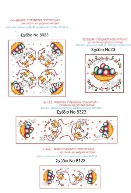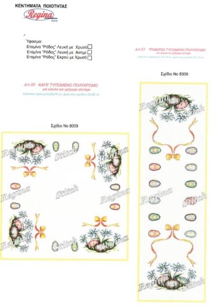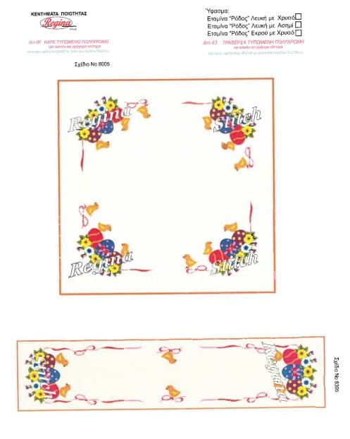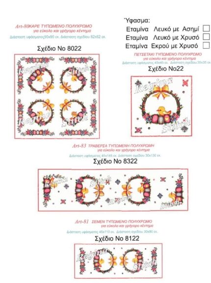| Επιλογή κεντήματος | Όλο το σέτ, Όλο το σέτ με κλωστές, Τραβέρσα, Τραβέρσα με κλωστές, Καρέ, Καρέ με κλωστές, Πετσετάκι, Πετσετάκι με κλωστές, Σεμέν, Σεμέν με κλωστές, Τραπεζοκαρέ, Τραπεζοκαρέ με κλωστές |
