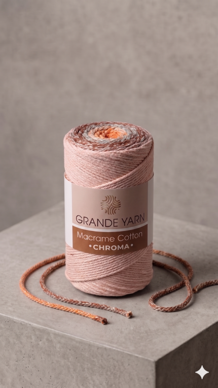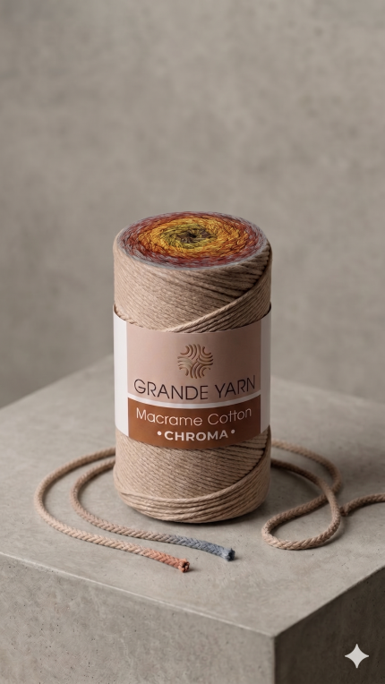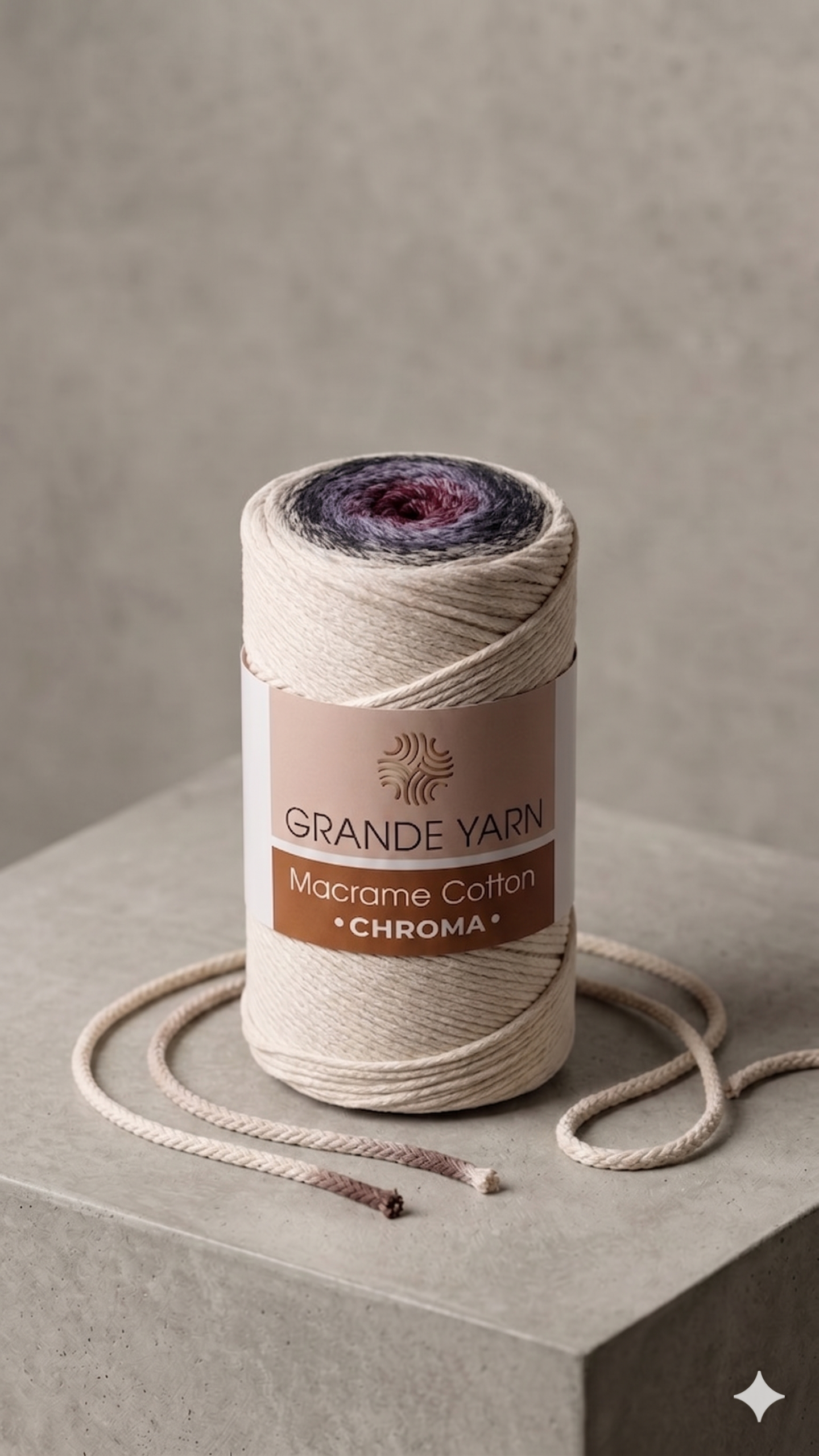 Το Macrame Cotton Chroma της Grande Yarn είναι ένα ιδιαίτερο νήμα που συνδυάζει φυσική υφή με εντυπωσιακό χρωματικό αποτέλεσμα, ιδανικό για δημιουργίες που ξεχωρίζουν. 🎨✨